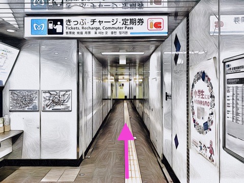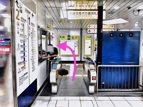 7号車2番扉(先頭から1両目)付近の改札を出て左へ