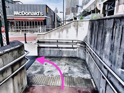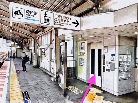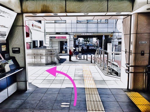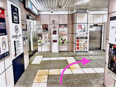 2号車1番扉(先頭から6両目)付近のエレベーターで改札階(1F)へ