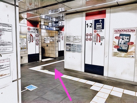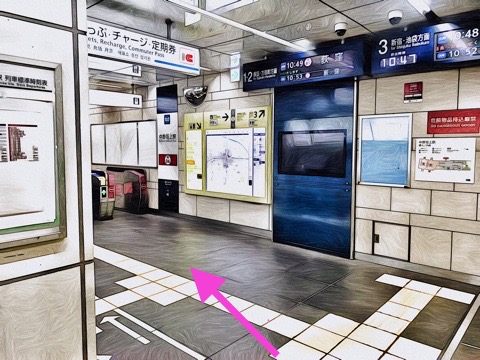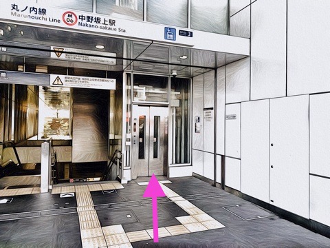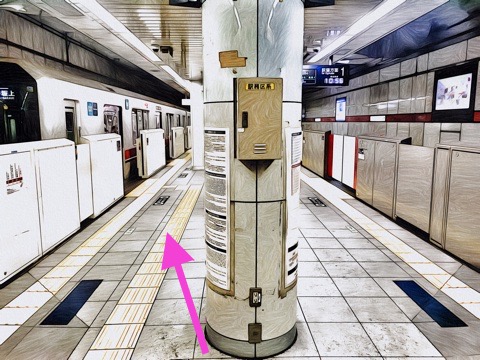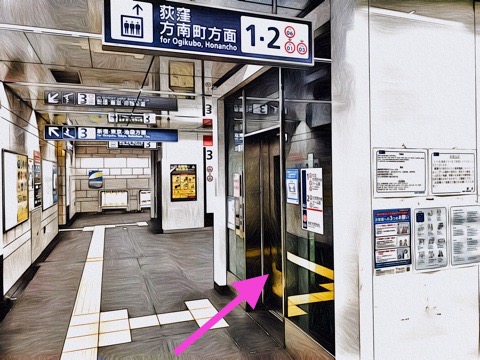 ホーム左が方南町方面行き(3両編成:1号車1番扉/先頭から1両目、6両編成:2号車3番扉/先頭から2両目)