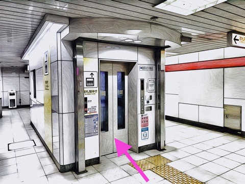 4号車1番扉(先頭から3両目)付近のエレベーターへ