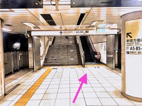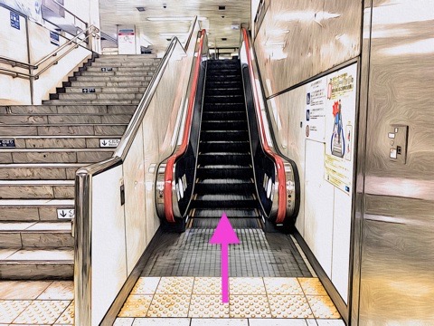 1号車1番扉(先頭から6両目)付近のエスカレーターへ