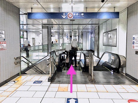 改札を入り前方のエスカレーターへ