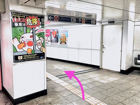 3番線が浅草方面行きホーム(1号車1番扉/先頭から6両目)
