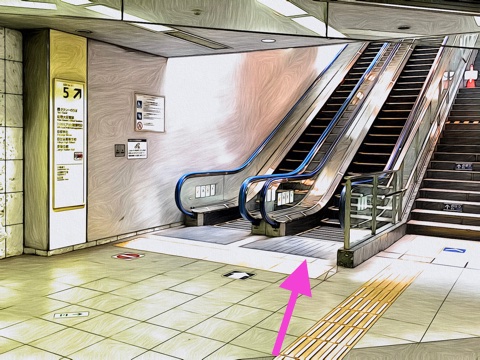 4号車3番扉(先頭から3両目)付近から左のエスカレーターへ