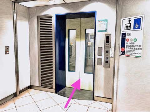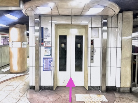 2号車3番扉(先頭から2両目)付近のエレベーターで改札階へ