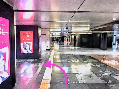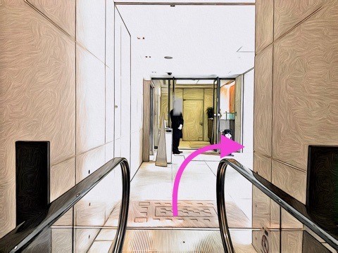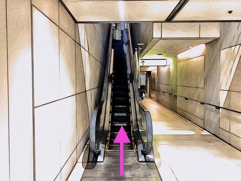 エスカレーターで東京メトロ日比谷線ホーム階へ