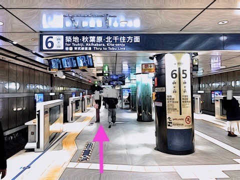エスカレーターで東京メトロ日比谷線ホーム階へ