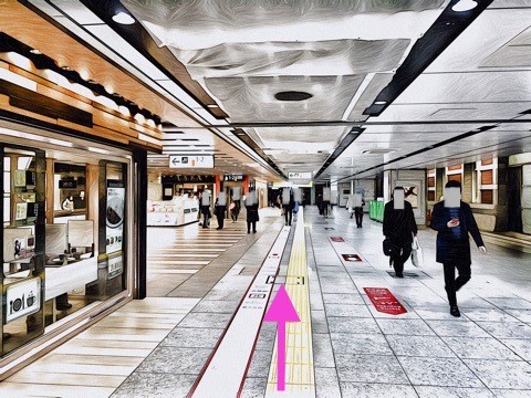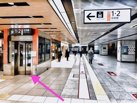4号車1番扉(先頭から4両目)付近のエレベーターで改札階へ