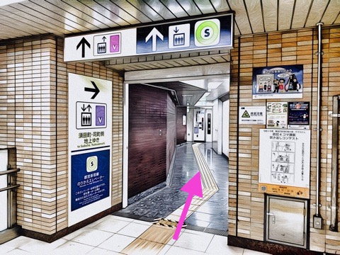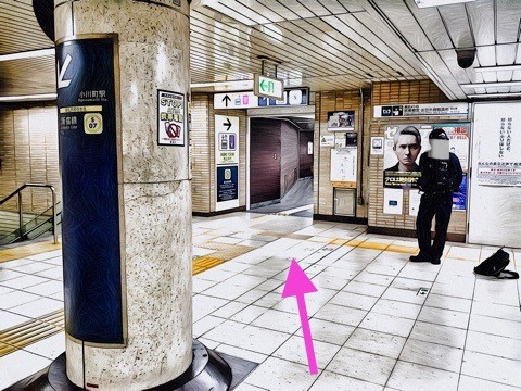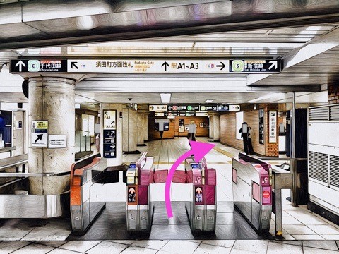 6号車3番扉(先頭から6両目)付近から左にある改札へ