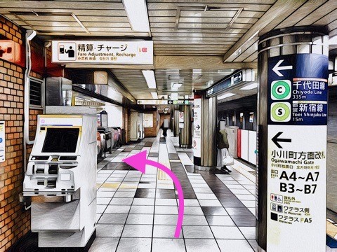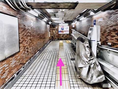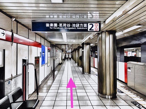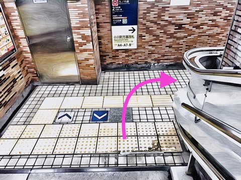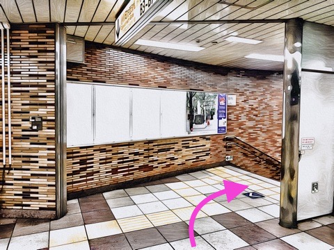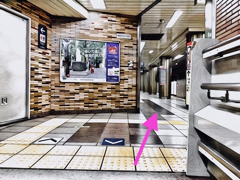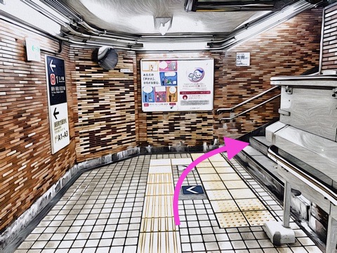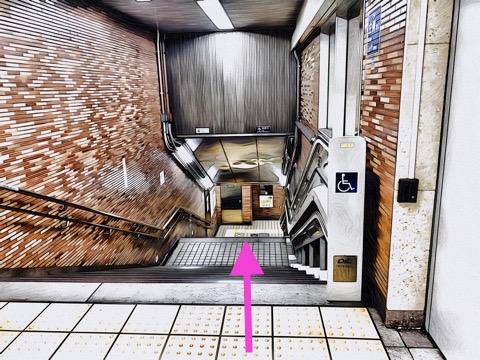 1号車2番扉(先頭から1両目)付近から右にある階段昇降機へ