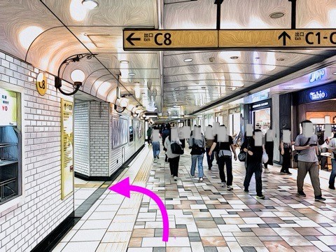 6号車3番扉(先頭から1両目)付近からエレベーターへ