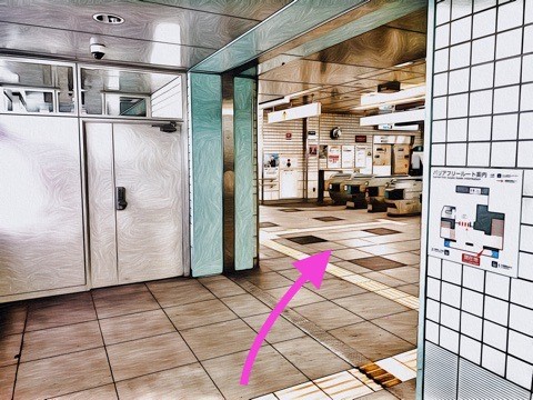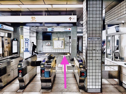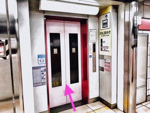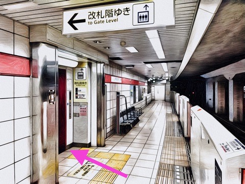 3両編成:1号車1番扉(先頭から1両目)、6両編成:1号車2番扉(先頭から1両目)付近のエレベーターへ