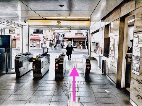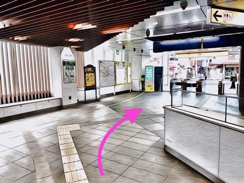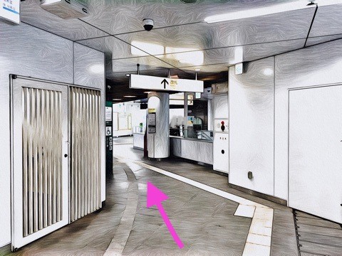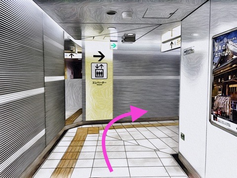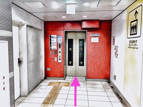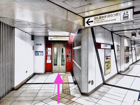 3両編成:2号車2番扉(先頭から2両目)、6両編成:5号車2番扉(先頭から5両目)付近のエレベーターでエレベーター乗換え階(B3階)へ