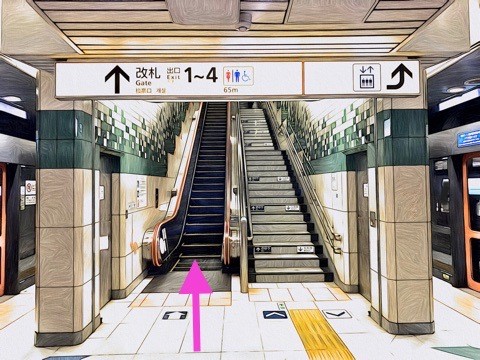 6号車1番扉(先頭から6両目)付近のエスカレーターへ