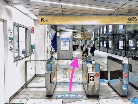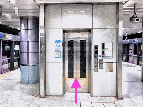 5号車2番扉 (6両編成:先頭から2両目、8両編成:先頭から4両目)付近のエレベーターで改札階へ