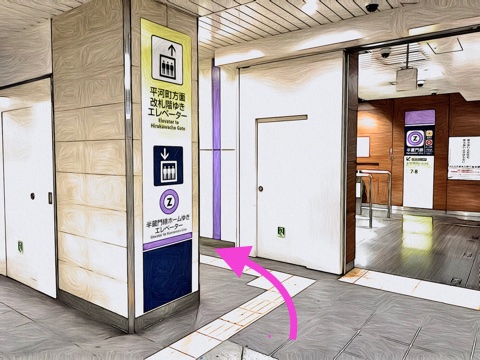 8両編成:8号車4番扉(先頭から1両目)、6両編成:6号車4番扉(先頭から1両目) 付近からエレベーターへ