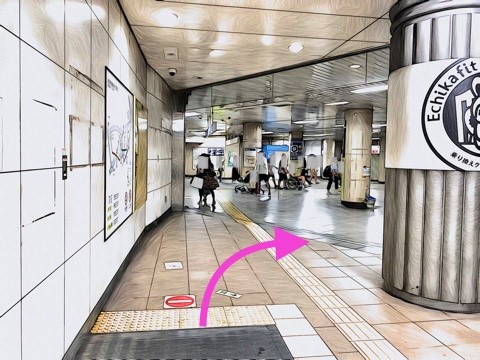 8両編成:8号車4番扉(先頭から1両目)、6両編成:6号車4番扉(先頭から1両目) 付近からエレベーターへ