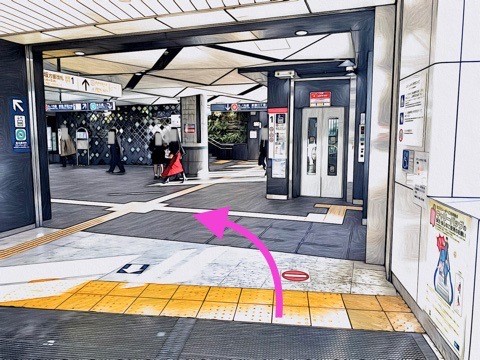 6号車4番扉(先頭から1両目)付近のエスカレーターで上の階へ
