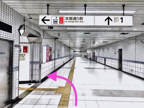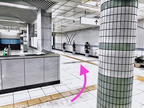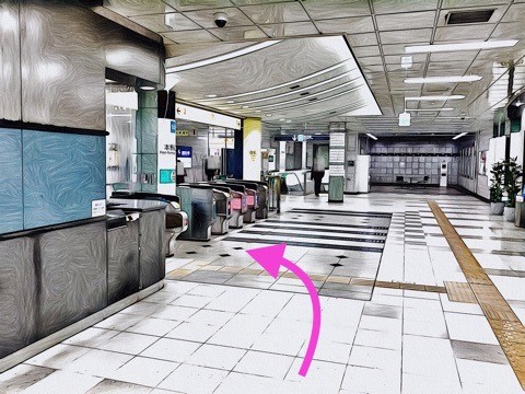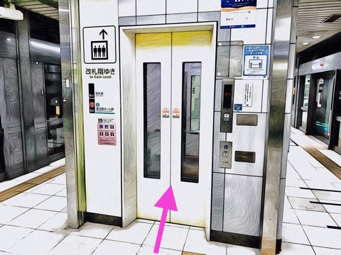 2号車2番扉(先頭から2両目)付近のエレベーターで改札階へ