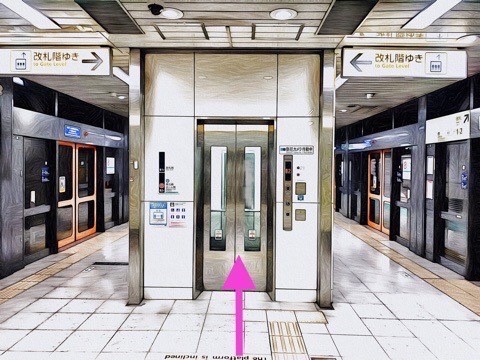 2号車4番扉(先頭から5両目)付近のエレベーターで改札階へ