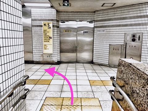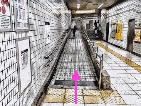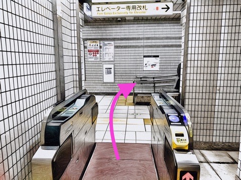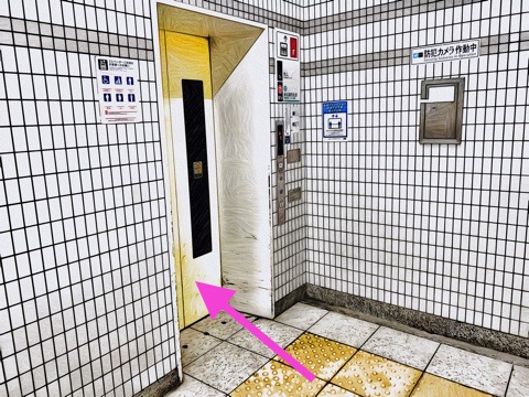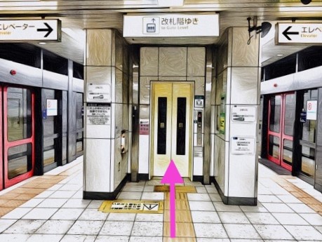 6両編成:1号車1番扉(先頭から1両目)、8両編成:3号車1番扉(先頭から3両目)付近のエレベーターで改札階へ