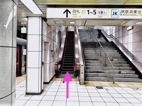 6両編成:3号車1番扉(先頭から4両目)、8両編成:5号車1番扉(先頭から4両目)付近のエスカレーターで改札階へ