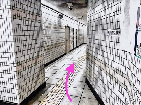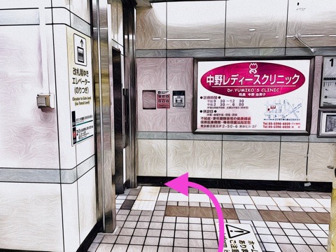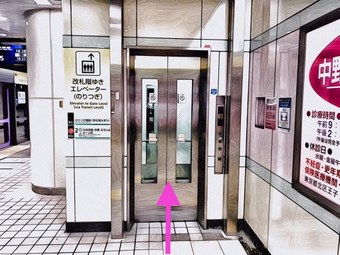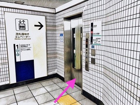 6両編成:3号車1番扉(先頭から4両目)、8両編成:3号車1番扉(先頭から6両目)付近のエレベーターへ