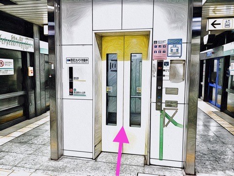 6両編成:5号車4番扉(先頭から5両目)、8両編成:5号車4番扉(先頭から5両目)付近のエレベーターで改札階へ