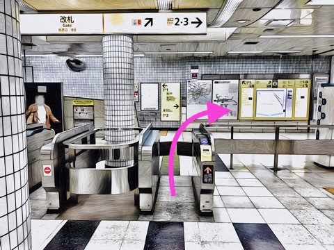 6両編成:3号車1番扉(先頭から3両目)、8両編成:3号車1番扉(先頭から3両目)付近のエスカレーターで改札階へ