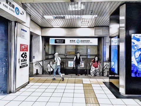 ⇒東京メトロ東西線 ⇒T03高田馬場 ⇒乗車 ⇒西船橋方面行き車両へ
