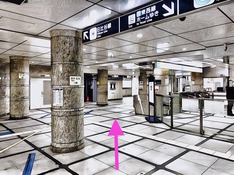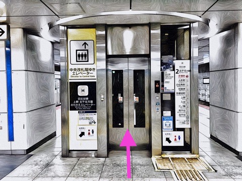 3号車2番扉(先頭から8両目)付近のエレベーターで日比谷線北千住方面行きホーム階へ