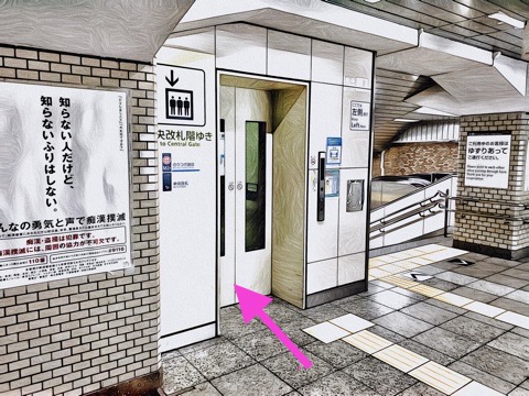7号車2番扉(先頭から7両目)付近のエレベーターで下の階へ