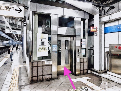 6号車2番扉(先頭から6両目)付近のエレベーターで改札階へ