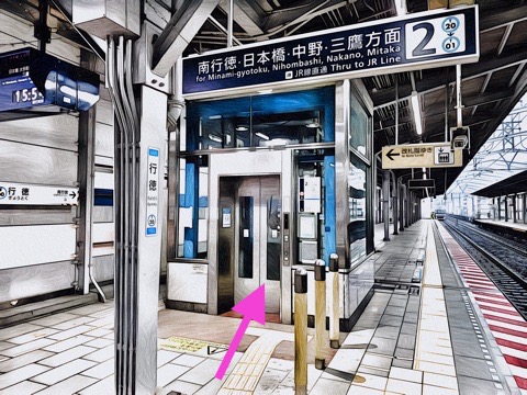 7号車1番扉(先頭から4両目)付近のエレベーターで改札階へ