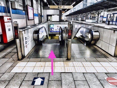 6号車4番扉(先頭から6両目)付近のエスカレーターで下の階へ