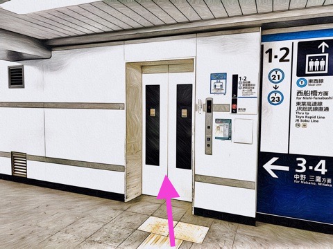 1,2番線ともに西船橋方面行きホーム(3号車4番扉/先頭から3両目)