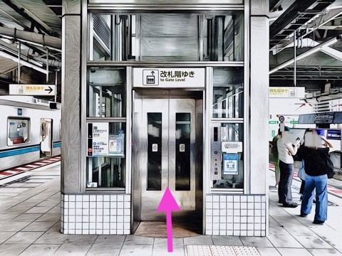 4号車1番扉(先頭から4両目)付近のエレベーターで改札階へ
