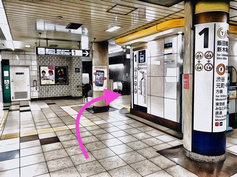 1番線が新木場方面行きホーム(5号車3番扉/先頭から6両目) ※ただし副都心線 渋谷方面行きもあり