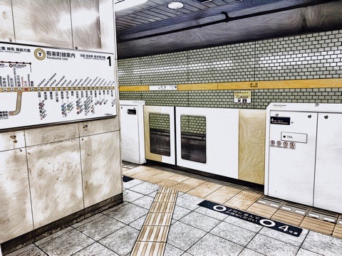 右の1番線が新木場方面行きホーム(4号車1番扉/先頭から7両目)