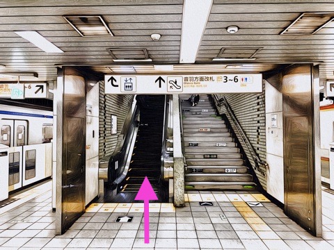 6号車4番扉(先頭から6両目)付近のエスカレーターで改札階へ