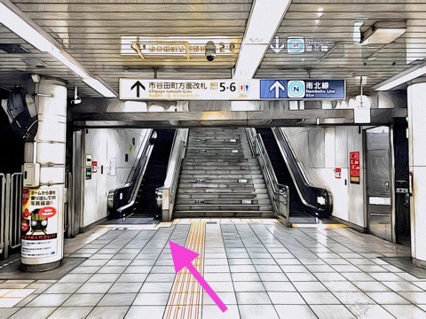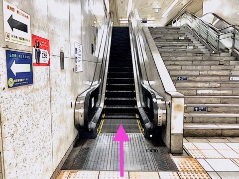 1号車1番扉(先頭から10両目)付近のエスカレーターへ