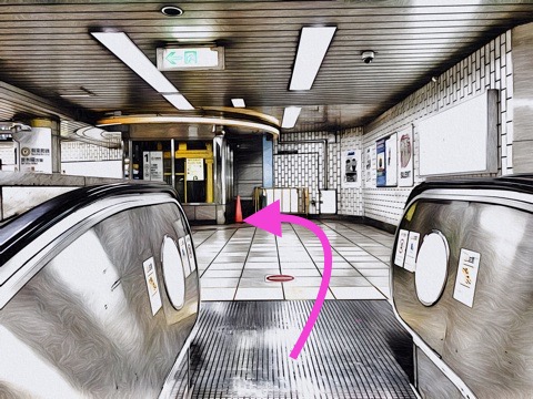 9号車4番扉(先頭から2両目)付近のエスカレーターへ