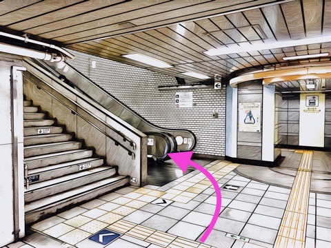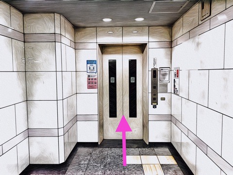 エスカレーターを降り左前方にあるエレベーター通路へ