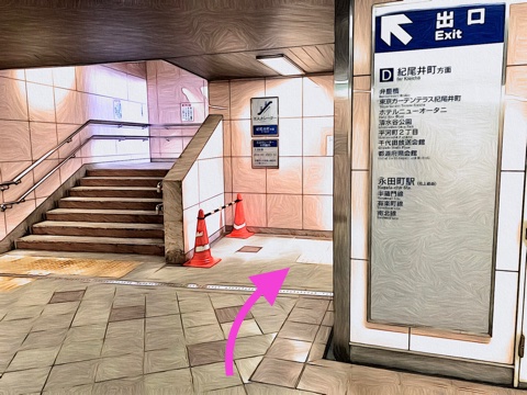 1号車1番扉(先頭から10両目)付近のエスカレーターへ