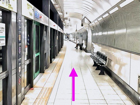 1号車1番扉(先頭から1両目)付近のエスカレーターへ