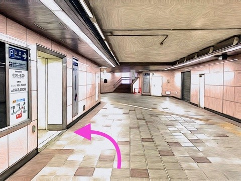 2号車1番扉(先頭から9両目) 付近のエレベーターで上の階(B3F)へ