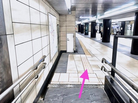 1番線が新木場方面行きホーム(5号車1番扉/先頭から6両目)