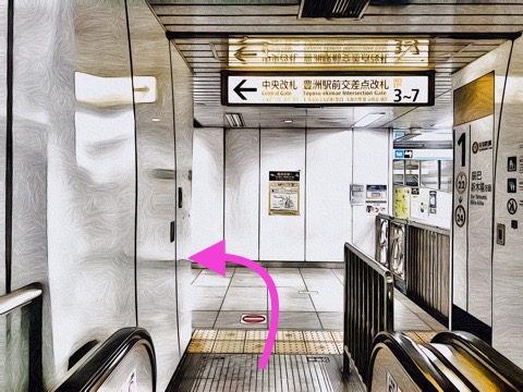 8号車1番扉(先頭から3両目)付近のエスカレーターで改札階へ