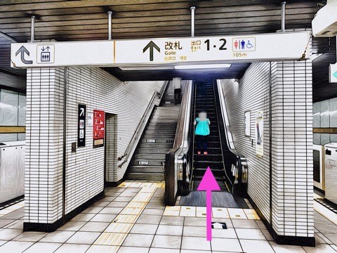 7号車4番扉(先頭から4両目)付近のエスカレーターで改札階へ